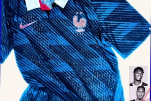 法国队官方社媒晒出球衣照片,正式推出法国队世界杯主客场球衣,姆巴佩、卡马文加担当模特。