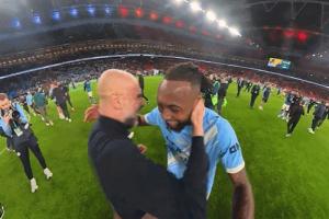 曼城官方晒视频,赛后曼城主帅瓜迪奥拉与塞梅尼奥拥抱,连拍塞梅尼奥胸口9下并说谢谢。