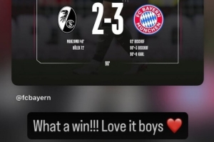 体育资讯4月5日讯 拜仁在本轮德甲让二追三,逆转绝杀弗赖堡。因伤缺阵的凯恩也在赛后通过社媒庆祝胜利。