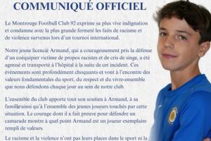 体育资讯04月13日讯 法国球队蒙鲁日92发布官方声明,注册在球队的13岁小将阿尔芒,在代表巴黎出战U15锦标赛时,因维护遭受种族歧视的队友被殴打,导致鼻骨骨折。